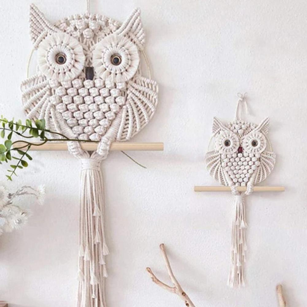 Item Name: Owl Pendant Material: Cotton Thread Features: Owl Shape, Handwoven, Bohemian Style, Wall Art Size Details: S, L: 45cm/17.72", W: 15cm/5.91" (Approx.) L, L: 80cm/31.5", W: 30cm/11.81" (Approx.)