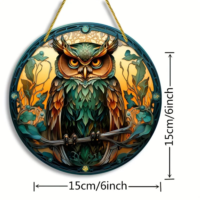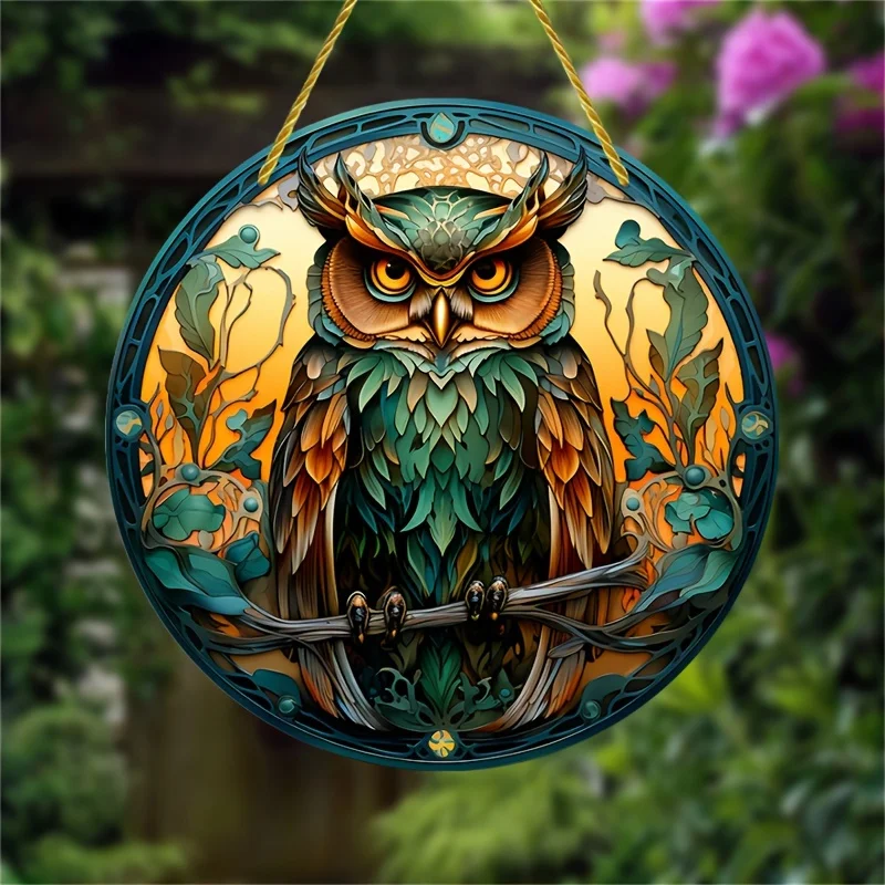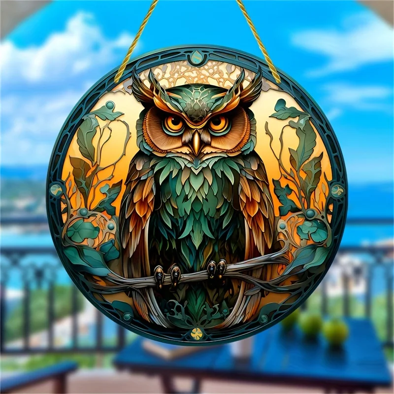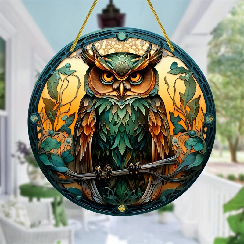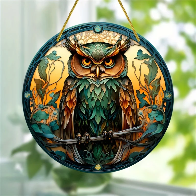 Owl Suncatcher,Stained Window Hanging, Acrylic,Round,Wreath Sign,Christmas Gift,porch,Wall Decor,Home,Room Decor